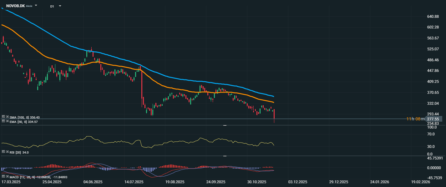 Akcie aktuálně testují úroveň 277,55 DKK, což je důležitá horizontální podpora. Cena se nachází hluboko pod klouzavými průměry – EMA 50 (334,57 DKK) i SMA 100 (356,43 DKK) – což jasně potvrzuje medvědí tržní nastavení. RSI se nachází na hodnotě 34,0, tedy těsně nad pásmem přeprodanosti, což naznačuje sílící prodejní tlak, ale i možnost technického odrazu.
