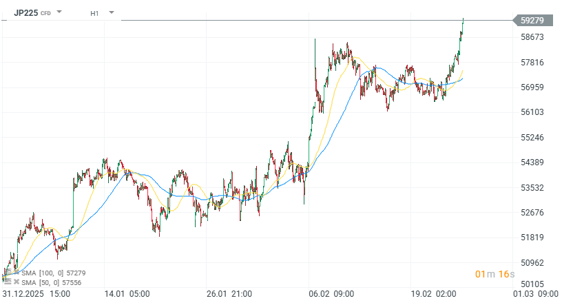 Od začátku roku si Nikkei připisuje přes 13 % a i dnes roste o 2 %. Současná hodnota se pohybuje na úrovni 58 500 bodů, což potvrzuje optimistický výhled stratégů