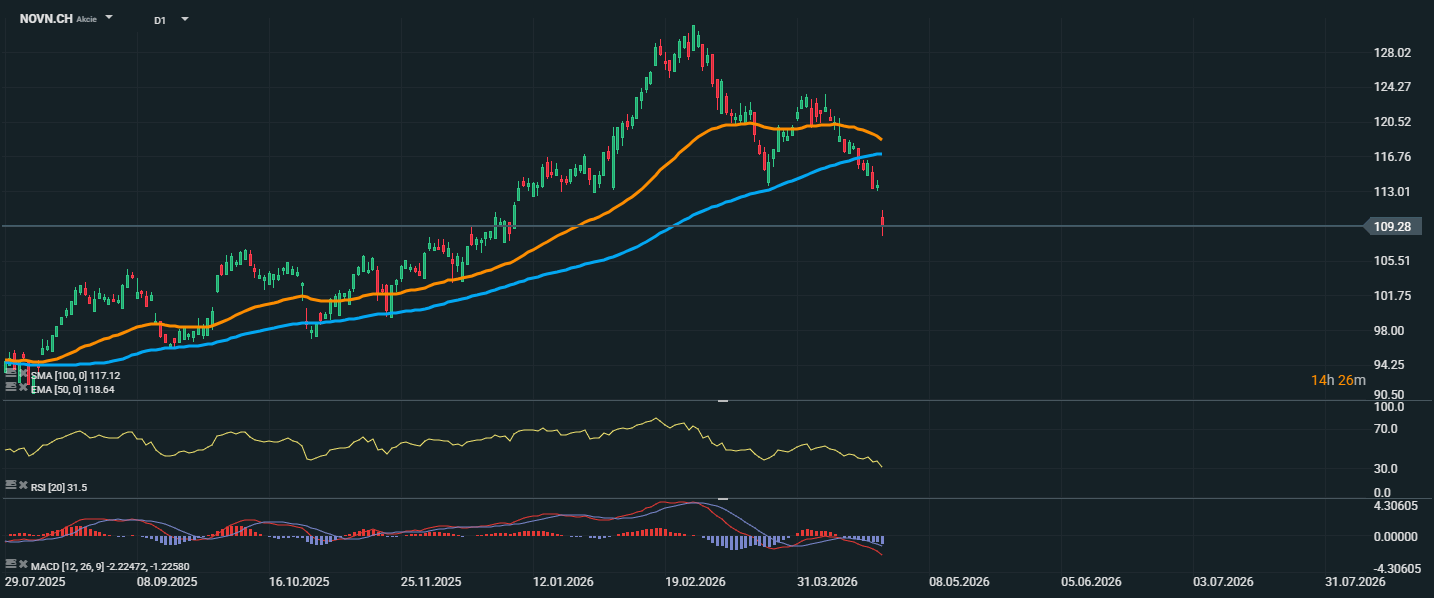 Akcie společnosti Novartis výrazně oslabily a aktuálně se obchodují kolem úrovně 109,28 CHF. Cena prudce prorazila pod oba klíčové klouzavé průměry, konkrétně pod EMA 50 na úrovni 118,64 CHF i pod SMA 100 na úrovni 117,12 CHF, což potvrzuje zhoršení technického nastavení. Tento pokles navazuje na předchozí slábnutí trendu po dosažení lokálního maxima v oblasti nad 128 CHF. Negativní signál podporuje také RSI, které se nachází na hodnotě 31,5. To znamená, že akcie jsou velmi blízko přeprodané zóny, ale zároveň stále ukazují na silný prodejní tlak. Pokud by RSI kleslo pod hranici 30, mohlo by to naznačit krátkodobé přeprodání a prostor pro technický odraz. Zatím však graf spíše ukazuje, že prodávající mají nad trhem výraznou převahu.