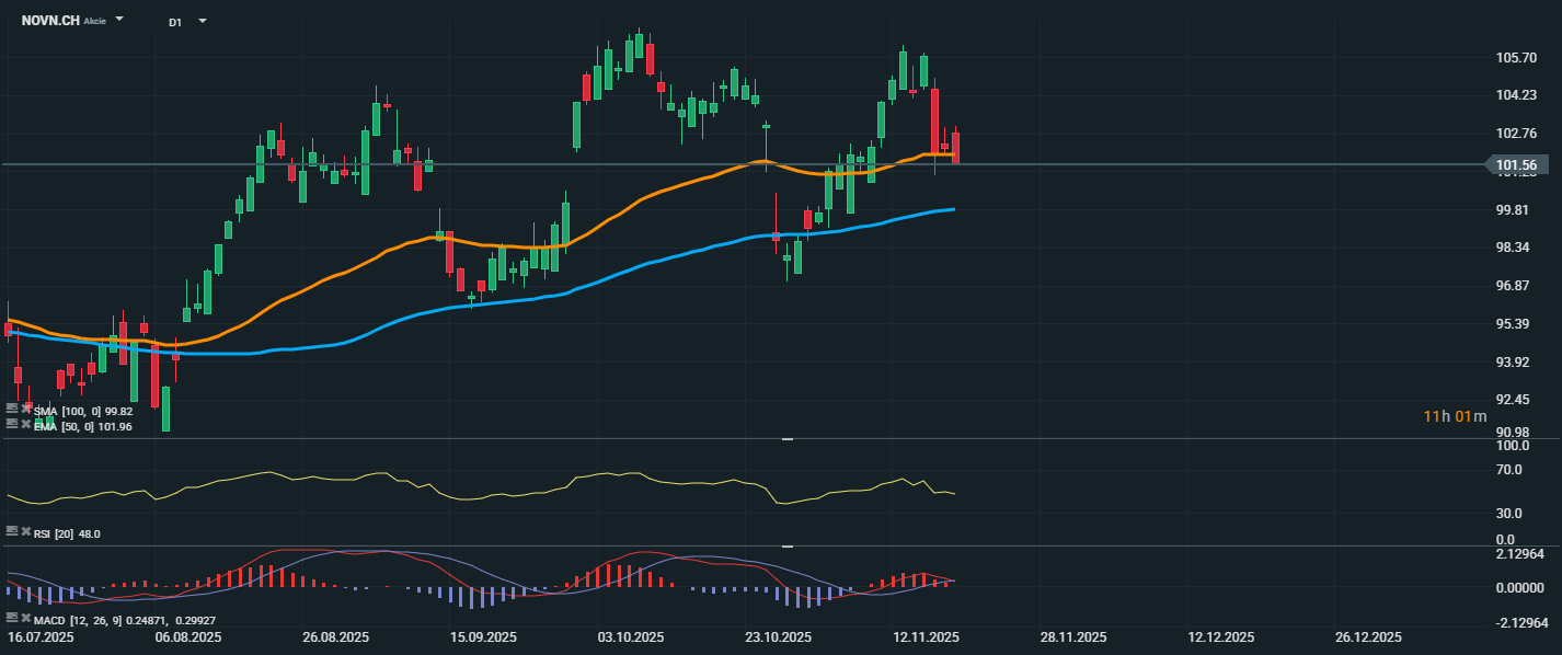 Akcie společnosti Novartis se aktuálně obchodují na ceně 101,56 CHF, přičemž v posledních dnech došlo k mírné korekci po předchozím růstu. Cena se v současnosti pohybuje těsně nad klouzavým průměrem EMA 50 (101,96 CHF) a stále zůstává nad SMA 100 (99,82 CHF), což naznačuje zachování střednědobého růstového trendu, ačkoliv momentálně oslabuje krátkodobá dynamika. RSI se nachází na hodnotě 48,0, tedy pod neutrální hranicí 50, což naznačuje slábnoucí momentum a mírný převahu prodejního tlaku. Z technického pohledu bude důležité, zda se akcie udrží nad psychologicky a technicky důležitou podporou kolem 100 CHF, kde se setkává SMA 100 a předchozí úroveň konsolidace.