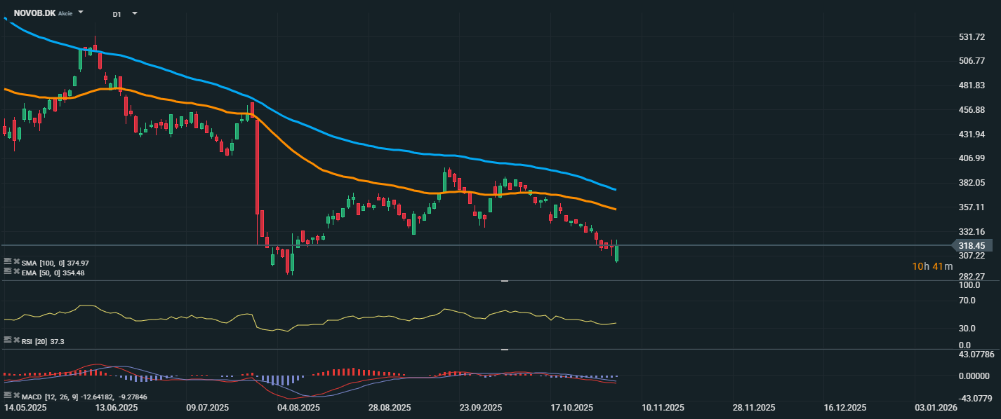 Akcie společnosti Novo Nordisk se aktuálně obchodují na úrovni 318,45 DKK a po delším sestupném trendu vykazují mírný odraz. Stále se však nacházejí hluboko pod klouzavými průměry EMA 50 (354,48 DKK) a SMA 100 (374,97 DKK), což potvrzuje pokračující medvědí trend. RSI se nachází na úrovni 37,3, tedy blízko přeprodané zóny, což může naznačovat potenciál k dalšímu odrazu. Nicméně MACD zůstává výrazně v záporných hodnotách, což stále varuje před slabým momentem a nezměněným klesajícím trendem.