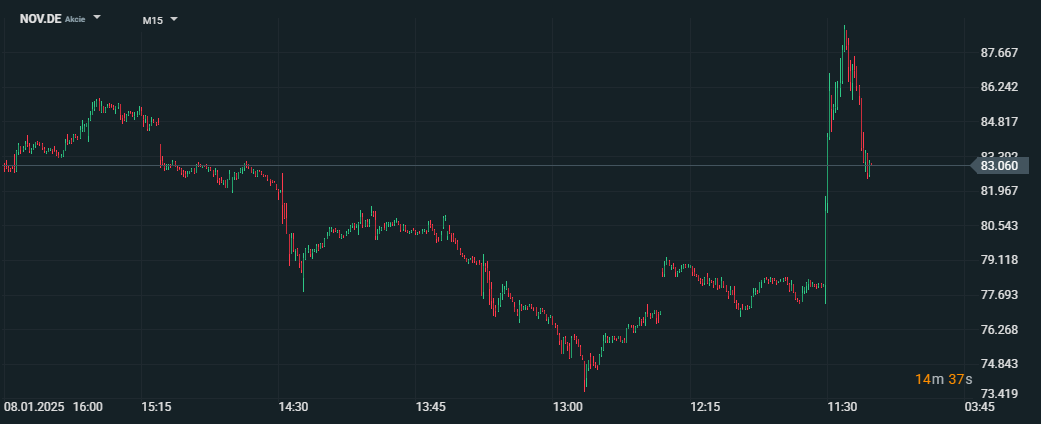 15min graf zobrazující pohyb ceny Novo Nordisk (NOV.DE) dne 8. ledna 2025. Akcie zaznamenaly prudký růst o 12 %, s maximem na hodnotě 87,667 EUR, než korigovaly na 83,060 EUR. Tento výrazný nárůst odráží pozitivní náladu investorů po slibných výsledcích klinických studií. Zdroj: xStation5