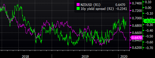 Spread mezi výnosy novozélandských a amerických dluhopisů se v poslední době změnil ve prospěch NZD. Zdroj: Bloomberg