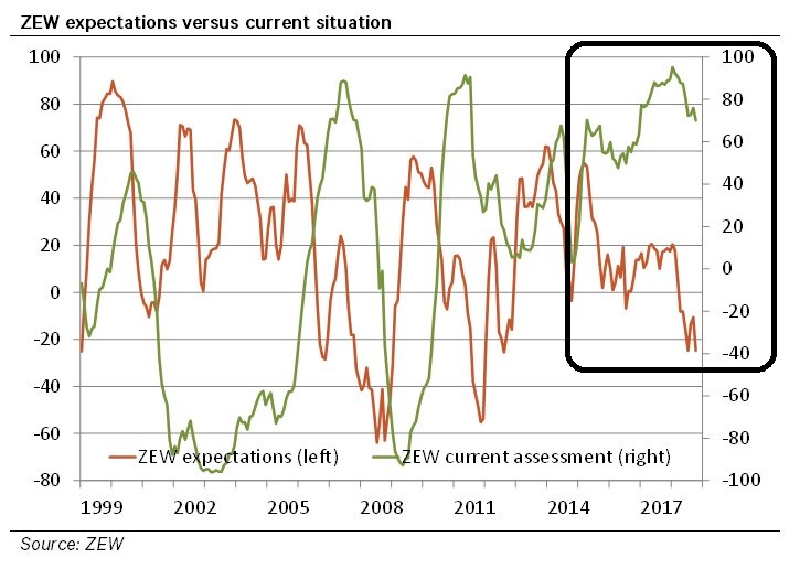 Pri ZEW indexe hodnotí aktuálnu situáciu pozitívne v čistom viac ako 70% opýtaných ekonómov a analytikov (v čistom znamená rozdiel medzi tými, čo ju vidia pozitívne a tými čo ju vidia negatívne). Vývoj v najbližších šiestich mesiacoch však vidí v čistom negatívne viac ako 25% respondentov. Medzera medzi aktuálnym a očakávaným vývojom je teda veľká. To je signál, že ekonomika je v neskorej fáze hospodárskeho cyklu, teda že rast bol v posledných kvartáloch na vrchole a že by mal spomaliť.