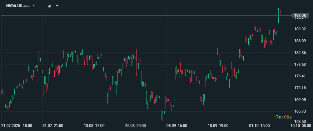Akcie Nvidie během dne posílily o 2–2,5 % a dosáhly nových maxim. Investiční banka Cantor Fitzgerald zvýšila cílovou cenu z 240 na 300 USD a uvedla, že „nejde o bublinu“. Analytici očekávají zisk 8 USD na akcii v roce 2026 a až 11 USD v roce 2027, což by mohlo podpořit další růst hodnoty akcií. Jiní analytici však zůstávají opatrní a upozorňují na vysoké ocenění a technickou překoupenost. Podle některých ukazatelů je růst ceny rychlejší než objemy obchodů, což může signalizovat potenciální korekci. Jensen Huang ale obavy z bubliny odmítá a poukazuje na rostoucí investice do AI infrastruktury, vysokou poptávku ze strany podniků i cloudových firem a dlouhodobé trendy ve využívání umělé inteligence. Zdroj: xStation5