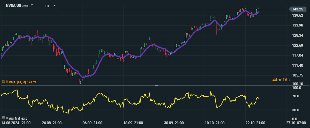 Analýza akcií Nvidie s indikátory RSI a EMA: Sledování relativní síly a krátkodobého trendu pro identifikaci potenciálních překoupených nebo přeprodaných podmínek. Zdroj. xStation5
