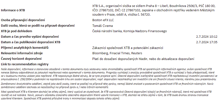 Rozdílové smlouvy jsou komplexní nástroje a v důsledku použití finanční páky jsou spojeny s vysokým rizikem rychlého vzniku finanční ztráty. U 71 % účtů retailových investorů došlo při obchodování s rozdílovými smlouvami u tohoto poskytovatele ke vzniku ztráty. Měli byste zvážit, zda rozumíte tomu, jak rozdílové smlouvy fungují, a zda si můžete dovolit vysoké riziko ztráty svých finančních prostředků. Investování je rizikové. Investujte zodpovědně. Tento materiál je marketingovou komunikací ve smyslu čl. 24 odst. 3 směrnice Evropského parlamentu a Rady 2014/65/EU ze dne 15. května 2014 o trzích finančních nástrojů, kterou se mění směrnice 2002/92/ES a směrnice 2011/61/EU (MiFID II). Marketingová komunikace není investiční doporučení ani informace doporučující či navrhující investiční strategii ve smyslu nařízení Evropského parlamentu a Rady (EU) č. 596/2014 ze dne 16. dubna 2014 o zneužívání trhu (nařízení o zneužívání trhu) a o zrušení směrnice Evropského parlamentu a Rady 2003/6/ES a směrnic Komise 2003/124/ES, 2003/125/ES a 2004/72/ES a nařízení Komise v přenesené pravomoci (EU) 2016/958 ze dne 9. března 2016, kterým se doplňuje nařízení Evropského parlamentu a Rady (EU) č. 596/2014, pokud jde o regulační technické normy pro technická ujednání pro objektivní předkládání investičních doporučení nebo jiných informací doporučujících nebo navrhujících investiční strategie a pro zveřejnění konkrétních zájmů nebo náznaků střetu zájmů nebo jakékoli jiné rady, a to i v oblasti investičního poradenství, ve smyslu zákona č. 256/2004 Sb., o podnikání na kapitálovém trhu. Marketingová komunikace je připravena s nejvyšší pečlivostí, objektivitou, prezentuje fakta známé autorovi k datu přípravy a neobsahuje žádné hodnotící prvky. Marketingová komunikace je připravena bez zohlednění potřeb klienta, jeho individuální finanční situace a nijak nepředstavuje investiční strategii. Marketingová komunikace nepředstavuje nabídku k prodeji, nabídku, předplatné, výzvu na nákup, reklamu nebo propagaci jakýchkoliv finančních nástrojů. Společnost XTB S.A., organizační složka nenese odpovědnost za jakékoli jednání nebo opomenutí klienta, zejména za získání nebo zcizení finančních nástrojů, na základě informací obsažených v této marketingové komunikaci. V případě, že marketingová komunikace obsahuje jakékoli informace o jakýchkoli výsledcích týkajících se finančních nástrojů v nich uvedených, nepředstavují žádnou záruku ani předpověď ohledně budoucích výsledků. Minulá výkonnost nemusí nutně vypovídat o budoucích výsledcích a každá osoba jednající na základě těchto informací tak činí zcela na vlastní riziko.