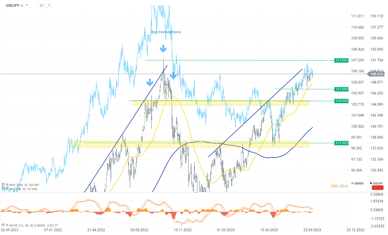 USDJPY se konsoliduje na vysokých úrovních pod 150, což naznačuje slábnoucí dynamiku nedávného vzestupného trendu. Zdá se, že indikátor MACD potvrzuje totéž a ukazuje na přetrvávající divergenci. Z tohoto důvodu doporučujeme zaujmout krátkou pozici na USDJPY a nastavit stop loss pro správné řízení rizik.