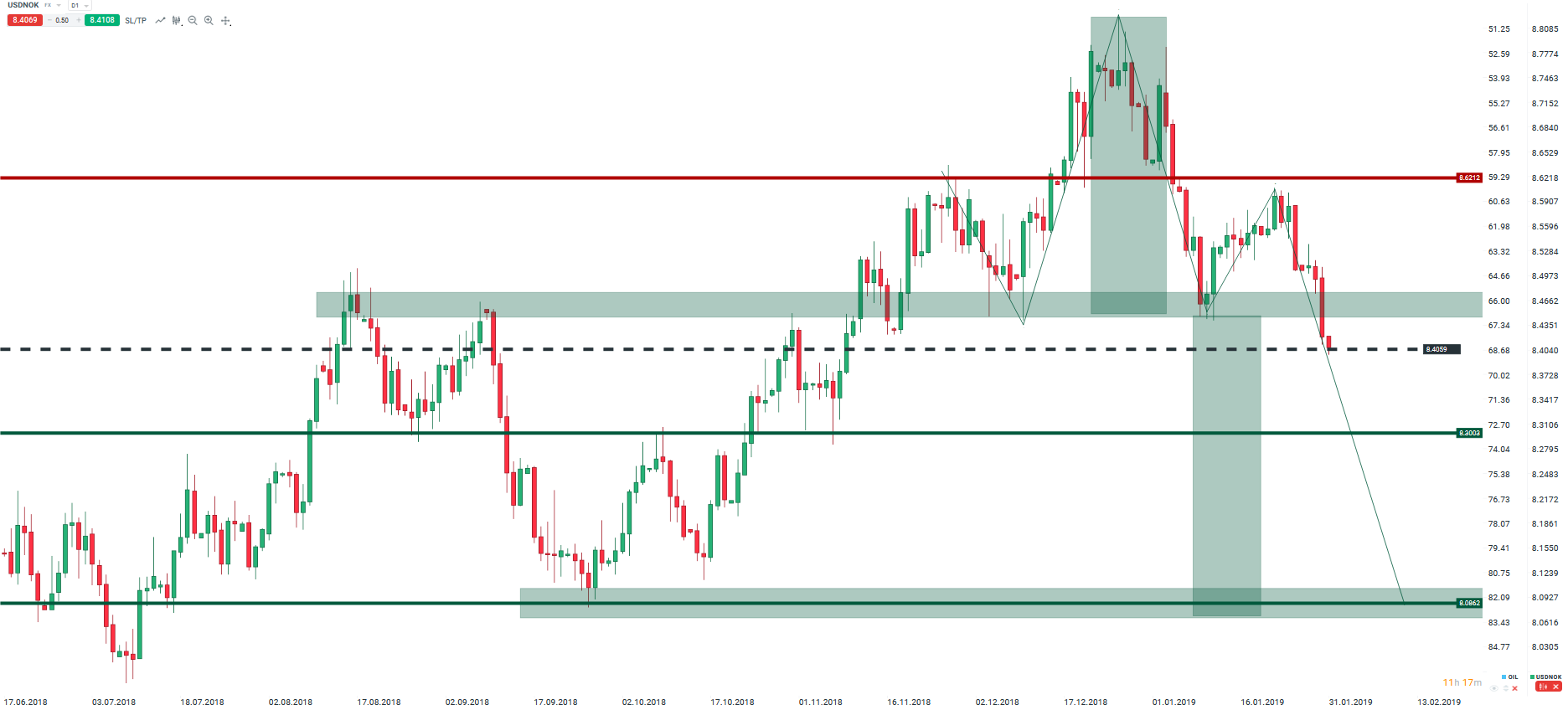 Americký dolar je od včerejšího zasedání Fedu slabý díky holubičímu komentáři a signalizovanému zastavení růstu úrokových sazeb. V Norsku ale inflace stále zesiluje a šance na růst sazeb sílí. Jejich zvýšení bychom se tak mohli dočkat už v březnu. Rostou navíc také ceny ropy, se kterými je norská koruna tradičně do značné míry svázána. Co se grafu týká, máme za sebou prolomení zajímavého supportu a pokud USDNOK vyplní mezeru potenciálního breaku z head and shoulders formace, cena může klesnout až na 8.06.