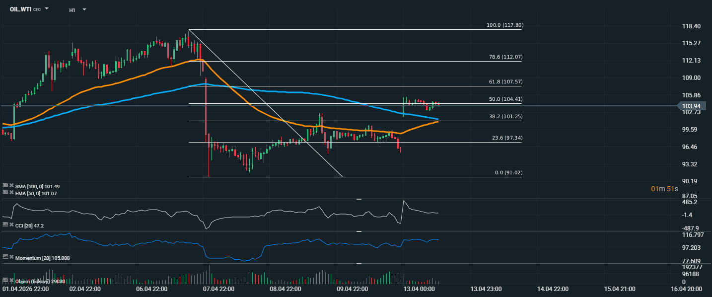Cena ropy WTI se obchoduje kolem 103,94 USD a po prudkém výkyvu se nyní stabilizuje v blízkosti 50% Fibonacciho retracementu na úrovni 104,41 USD. Trh se zároveň drží nad klouzavými průměry EMA 50 na 101,07 USD i SMA 100 na 101,49 USD, což naznačuje, že krátkodobá technická struktura zůstává přes předchozí volatilitu stále spíše pozitivní. Po ostrém propadu přišla rychlá stabilizace a následný návrat nad důležité technické hladiny, což ukazuje na aktivitu kupců.