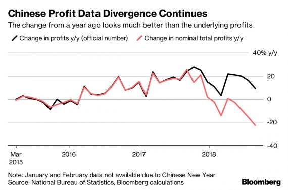 Čína pociťuje obchodné vojny viac, než sa na prvý pohľad môže zdať. V posledných mesiacoch sa prudko roztvárajú nožnice medzi oficiálnymi ziskmi a nominálnymi, ktorých rast je dokonca záporný. V minulosti sa pritom tieto dva časové rady hýbali spolu. Zaváňa to teda určitými účtovnými manipuláciami. Paradoxne, jedná sa predovšetkým o súkromné a nie štátne firmy (@JDMayger):