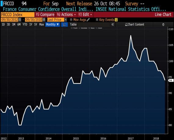 Francúzsko sa podľa všetkého po niekoľkých kvartáloch vracia do pozície nízko rastúcej ekonomiky eurozóny. Po podnikovej dôvere prudko padá aj spotrebiteľská dôvera (to je dosť neobvyklé, podniková dôvera kvôli slabším exportom klesá takmer v celej EÚ, spotrebiteľská dôvera sa však plus/mínus drží). Aktuálne je najnižšie od jari 2016. Popri slabších exportoch sa krajina teda môže pripraviť aj na slabšiu spotrebu. Btw. prepad spotrebiteľskej dôvery môže byť jeden z dôvodov, prečo Macronovi padá popularita (@Schuldensuehner):