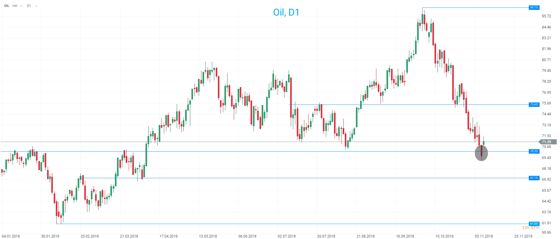 Máme za sebou ostrý start do nového týdne s výraznými pohyby napříč finančními aktivy. Hlavním tématem pondělního dopoledne byla ropa, která rostla o více než 2 %. Na trhu se objevily zprávy, že by Saúdská Arábie mohla už od prosince snížit těžbu o 500 tis. barelů ropy denně. Saúdský ministr pro energie, Khalid al Falih, řekl, že na základě analýz mezi členy OPEC by organizace mohla snížit těžbu o 1 mil. barelů. Není příliš složité hledat v těchto dnech motivaci pro snížení těžby. Ceny ropy výrazně klesly ze čtyřletých maxim, na kterých se ropa pohybovala ještě na počátku října. V minulém týdnu ceny klesly až do medvědího teritoria. Brent se dostal až pod 70 dolarů za barel a texaský ropný benchmark WTI neudržel hladinu 60 dolarů. Přestože ceny vystřelily v pondělí ráno nad zmíněné hladiny, tak pro stabilizaci na ropném trhu možná bude třeba udělat ještě více.