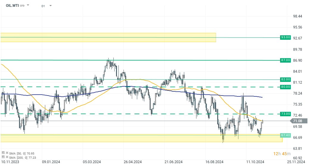 OIL.WTI posiluje na 71,10 USD za barel, přičemž testuje místní zónu rezistence. Klíčová úroveň podpory, která tento týden zabránila dalším poklesům, zůstává kolem 67 USD.