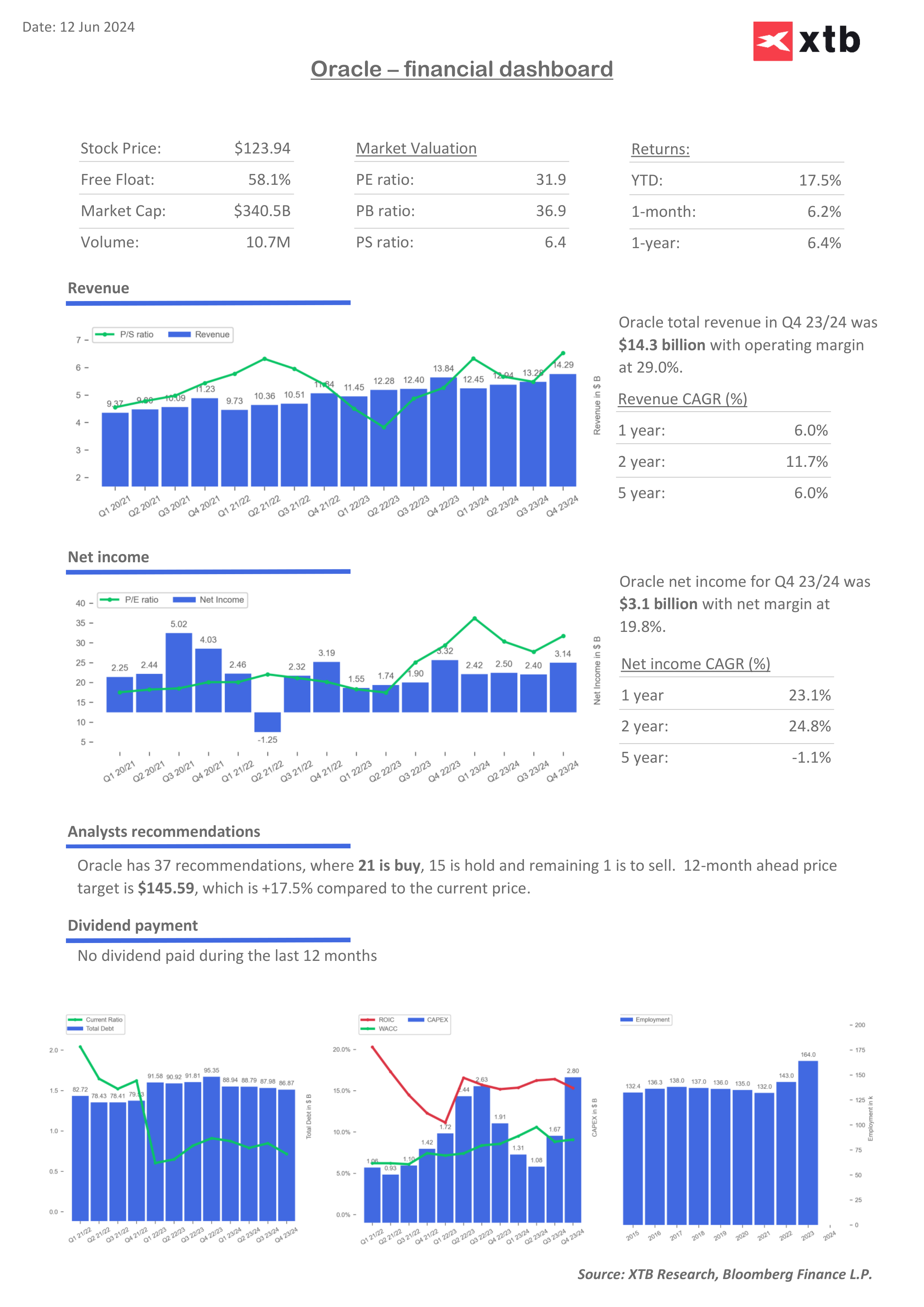 Za celý fiskální rok 2024 vykázala společnost Oracle celkové tržby ve výši 53,0 miliardy USD, což představuje 6% nárůst. Příjmy z cloudových služeb a licenční podpory vzrostly o 12 % na 39,4 miliardy USD, zatímco příjmy z cloudové infrastruktury vzrostly jen ve 4. čtvrtletí o 42 %. Navzdory poklesu příjmů z cloudových licencí a on-premise licencí zůstaly provozní příjmy a marže společnosti Oracle solidní - provozní příjmy bez použití metodiky GAAP vzrostly ve 4. čtvrtletí o 8 % na 6,7 miliardy USD a provozní cash flow dosáhlo za celý rok 18,7 miliardy USD, což představuje 9% nárůst.