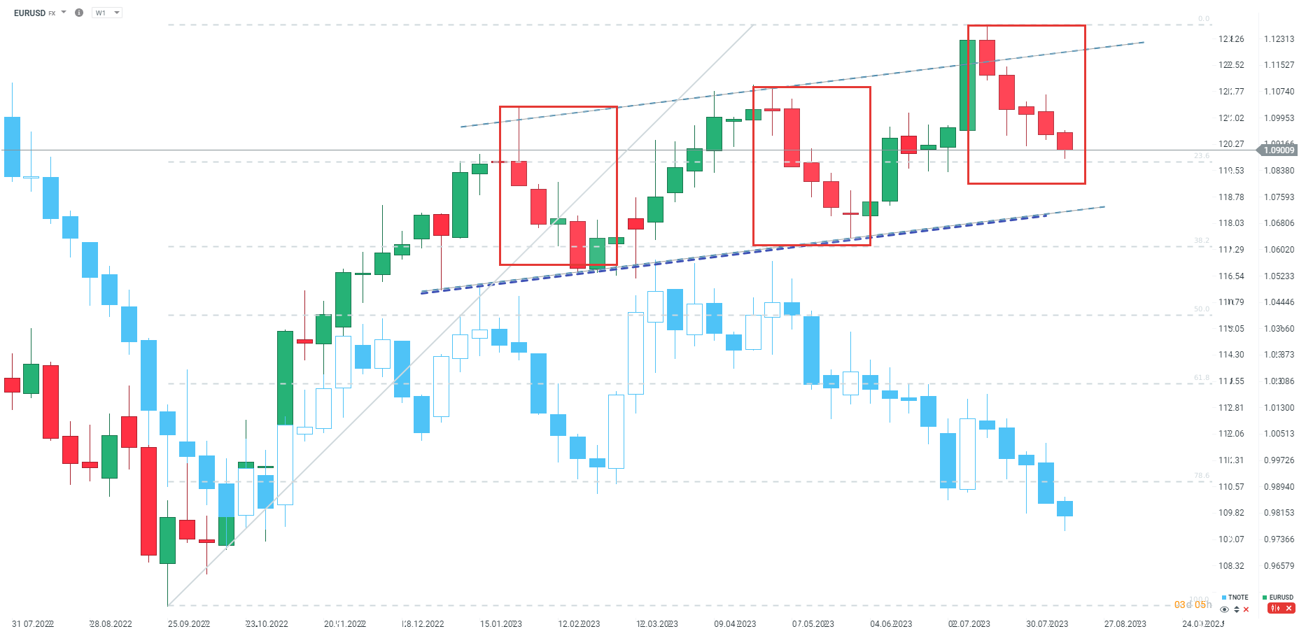 EURUSD zaznamenal test úrovně 1,0900. Fibonacciho retracement 23,6 je důležitým supportem, podíváme-li se na reakci týdenních svíček v červnu. Mírně níže se nachází rozsah předchozí korekce klesajícího trendu. Pokud se TNOTE odrazí ode dna, mohlo by to pro EURUSD znamenat bod obratu. Pokud však zároveň zápis z jednání Fedu ukáže odhodlání k dalšímu zvýšení, pak by EURUSD mohl ustoupit až k úrovni 1,0800 a TNOTE do blízkosti 109 bodů. Zdroj: xStation5