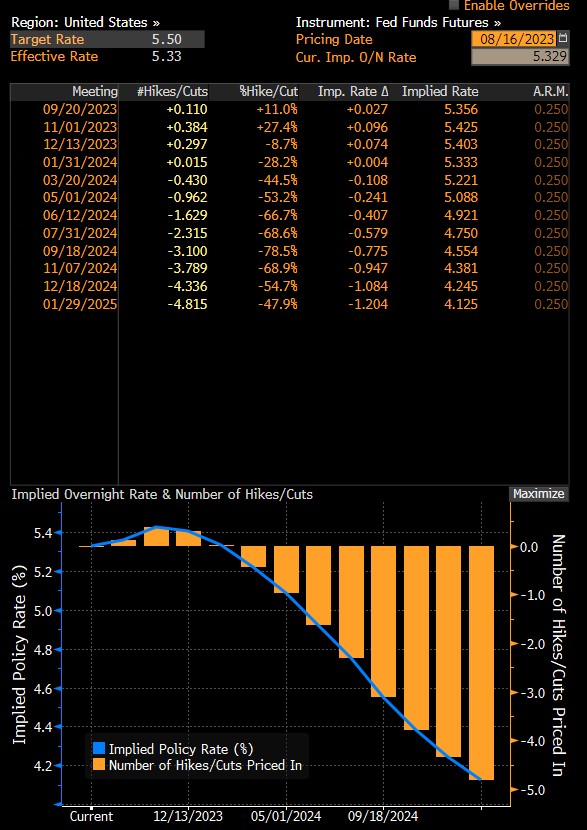 Trh již nevidí žádnou šanci na plné zvýšení úrokových sazeb v tomto roce. Zápis z jednání pravděpodobně nepovede ke zvýšení očekávání zvýšení sazeb. Existuje šance na posílení mírně holubičího vyznění červencového zasedání, což může vést k oslabení dolaru. Fed samozřejmě ještě oficiálně nepřiznal, že se zvyšováním sazeb skončil. Zdroj: Bloomberg Finance LP