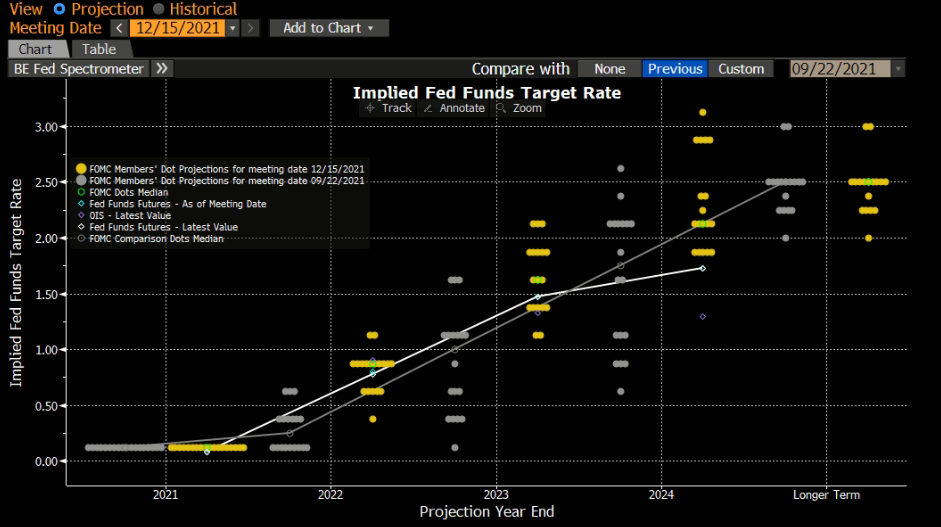 Centrálna banka si teda otvára rýchlejším obmedzovaním nákupov priestor pre skorší rast úrokových sadzieb, ktorého by sme sa teoreticky mohli dočkať už v priebehu druhého kvartálu budúceho roka. Druhou vecou je posun v takzvanom „Dot Plote“ – ide o akúsi projekciu vedúcich členov FEDu pomocou ktorej zobrazujú svoj postoj voči zvyšovaniu úrokových sadzieb. Včera zverejnený Dot Plot (obrázok pod textom, každá bodka predstavuje jedného člena FEDu a to, na akej úrovni vidí úrokové sadzby počas jednotlivých rokov – žlté bodky sú názory z posledného zasadnutia, sivé bodky sú názory rovnakých ľudí zo septembra – je teda viditeľný citeľný presun bodiek nahor, čo znamená, že členovia vidia sadzby vyššie, ako naposledy) naznačuje, že v priebehu budúceho roka by sme sa mohli dočkať dokonca troch zvýšení úrokových sadzieb, a teda konkrétne o 0,75 percentuálneho bodu. Vzhľadom na výrazne rastúcu infláciu teda nie sú dané kroky prekvapením a počítalo sa s nimi – FED ich minulý týždeň už len formálne potvrdil.