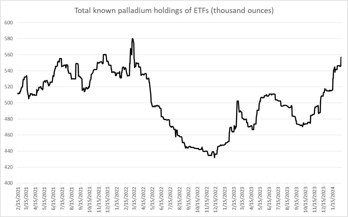 Zatímco zlaté a stříbrné ETF byly včera čistými prodejci během cenového propadu, palladiové držby ETF vzrostly o 2,1 %! Jedná se o masivní jednodenní nárůst, který představuje meziroční nárůst na 8,2 %. Držba zlata v ETF je meziročně o 2,7 % nižší, zatímco držba stříbra je o 0,3 % nižší, než tomu bylo na konci roku 2023. Zdá se, že tento silný nárůst poptávky po palladiu ze strany ETF podporuje dnešní cenové zisky.