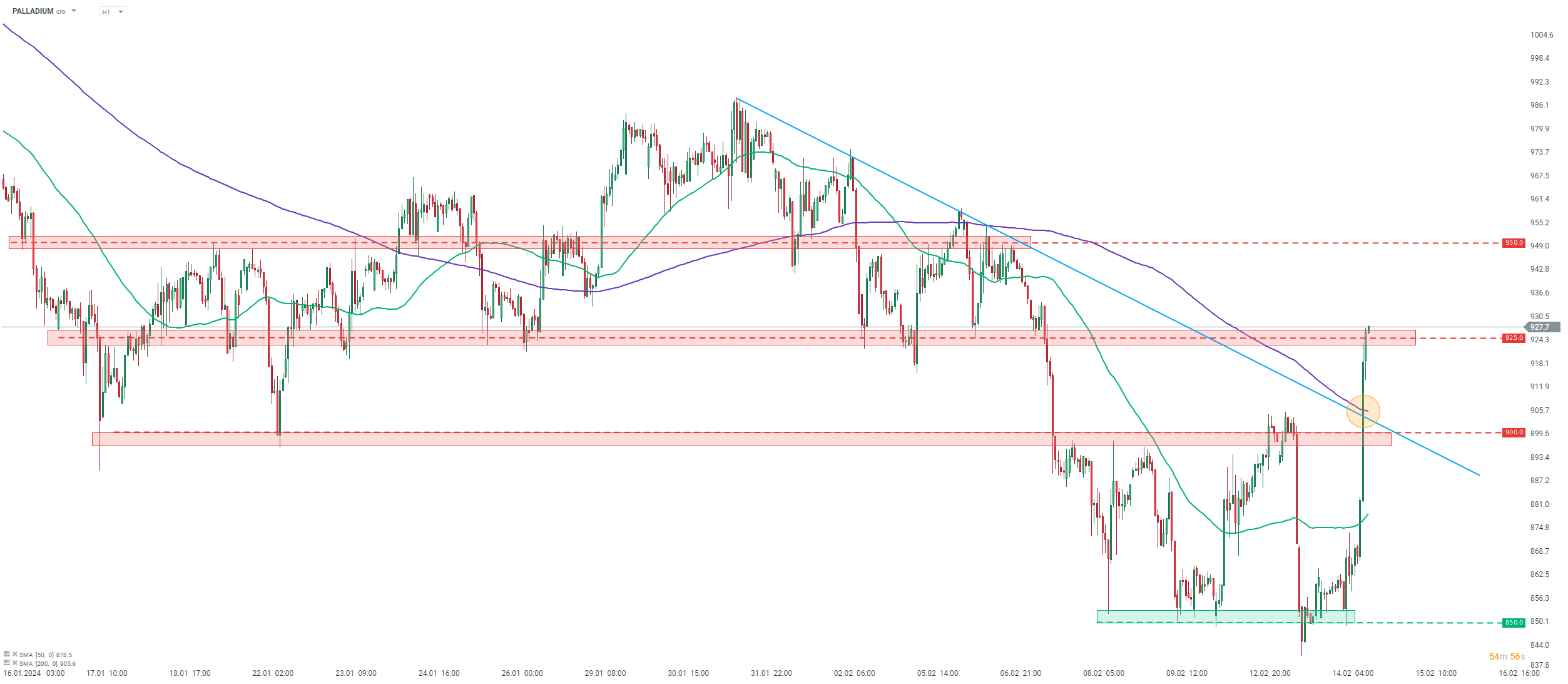 Když se podíváme na graf PALLADIUM v intervalu 1. pololetí, můžeme vidět, že cena dnes vyletěla nad cenovou zónu 900 USD za unci se silnou býčí dynamikou. Zisky pokračovaly s prolomením ceny nad sestupnou trendovou linií a 200hodinovým klouzavým průměrem (oranžový kruh) později. V době tisku probíhá pokus o prolomení odporu nad 925 USD, přičemž PALLADIUM se obchoduje na nejvyšší úrovni za týden. Další zónu odporu, kterou je třeba sledovat, lze nalézt v oblasti 950 USD za unci.