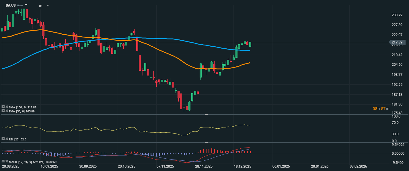 Akcie společnosti Boeing zaznamenaly v posledních týdnech výrazné oživení a aktuálně se obchodují na ceně 217,89 USD, čímž překonaly klouzavé průměry EMA 50 (205,89 USD) i SMA 100 (212,89 USD). Tento technický průraz nad klíčové úrovně podporuje pozitivní trendový obrat po předchozím medvědím období. RSI se nachází na hodnotě 62,6, což signalizuje silný nákupní zájem, ale zároveň stále ponechává prostor pro další růst bez bezprostředního rizika překoupenosti.