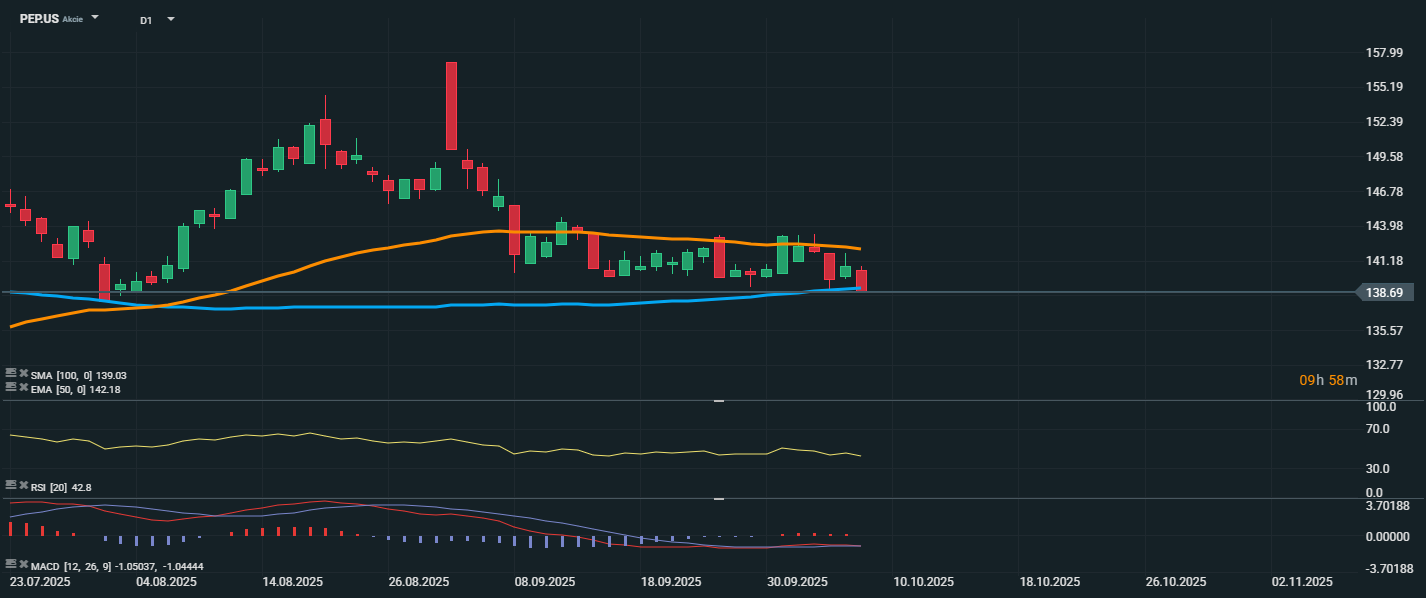 Akcie společnosti PepsiCo se obchodují v sestupném trendu. Aktuální cena se nachází na úrovni 138,69 USD, tedy těsně pod 100denním klouzavým průměrem (SMA 100 na 139,03 USD) a výrazně pod EMA 50 (142,18 USD). RSI se pohybuje na hodnotě 42,8, což odráží stále přítomný prodejní tlak, ale ještě nesignalizuje přeprodaný stav. MACD je hluboko v negativním teritoriu (−1,05), a histogram zůstává rovněž negativní, což potvrzuje setrvalé oslabování cen.