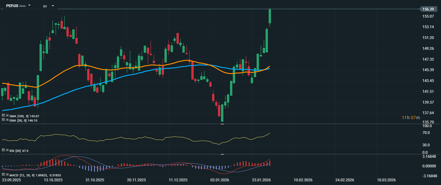 Akcie společnosti PepsiCo zaznamenaly prudký růst, cena se aktuálně obchoduje na úrovni 156,39 USD, což je nejvyšší hodnota za poslední měsíce. Tento růst představuje výrazné proražení nad oba klouzavé průměry – EMA 50 (146,10 USD) i SMA 100 (145,67 USD) – a potvrzuje tak obrat trendu směrem vzhůru. RSI se nachází na 67,9, tedy těsně pod hranicí překoupenosti, což ukazuje na silný nákupní zájem, ale zároveň naznačuje, že trh se začíná dostávat do přehřáté zóny.