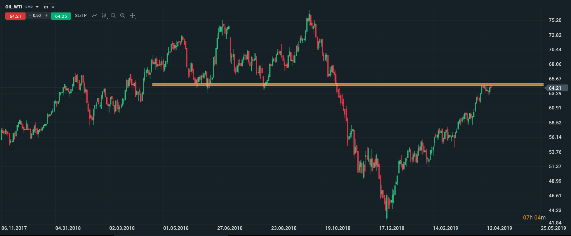 Cena ropy WTI (OIL.WTI na xStation) zatiaľ nedokázala preraziť rezistenciu okolo úrovne 65 USD/bbl. V prípade prerazenia tejto úrovne sa otvorí priestor na rest smerom k úrovni 70 USD/bbl. Zdroj: xStation5