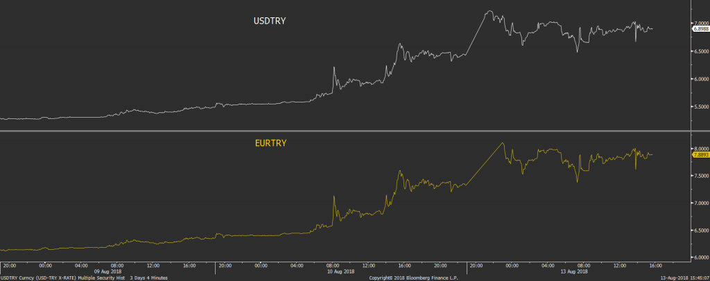 Situace v Turecku se v průběhu dne stabilizovala po víkendových útočných slovech prezidenta Erdogana, že turecká ekonomika byla zrazena a trumpovy cla byly dýkou do zad. Turecká centrální banka dnes provedla první záchranné kroky – snížila povinné rezervy pro banky, nicméně trh je ve formě dalšího propadu liry rychle posoudil jako nedostatečné. Lira tak zatím drží většinu ztrát, které nabrala od pátečního výplachu. Pár USDTRY se pohybuje okolo 6,9 liry za dolar a EURTRY okolo 7,9 liry za euro.