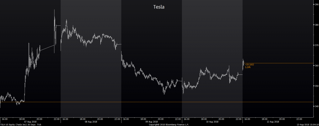 Velké ztráty dnes utrpěl na německém trhu Bayer kvůli pokutě $289 mil. jeho Monsantu, které v USA prohrálo soud o odškodnění v souvislosti s rakovinotvornými účinky Roundupu. Pod drobnohledem budou dnes také akcie Tesly. Její šéf Elon Musk oznámil, že tweet ve kterém minulý týden prohlásil, že „zdroje jsou zajištěny“ (pro stáhnutí automobilky Tesla z trhu) napsal po schůzce se saúdským fondem (a nevycucal si to z prstu). Financování by tak mohlo být blíže, než se v závěru minulého týdne zdálo.
