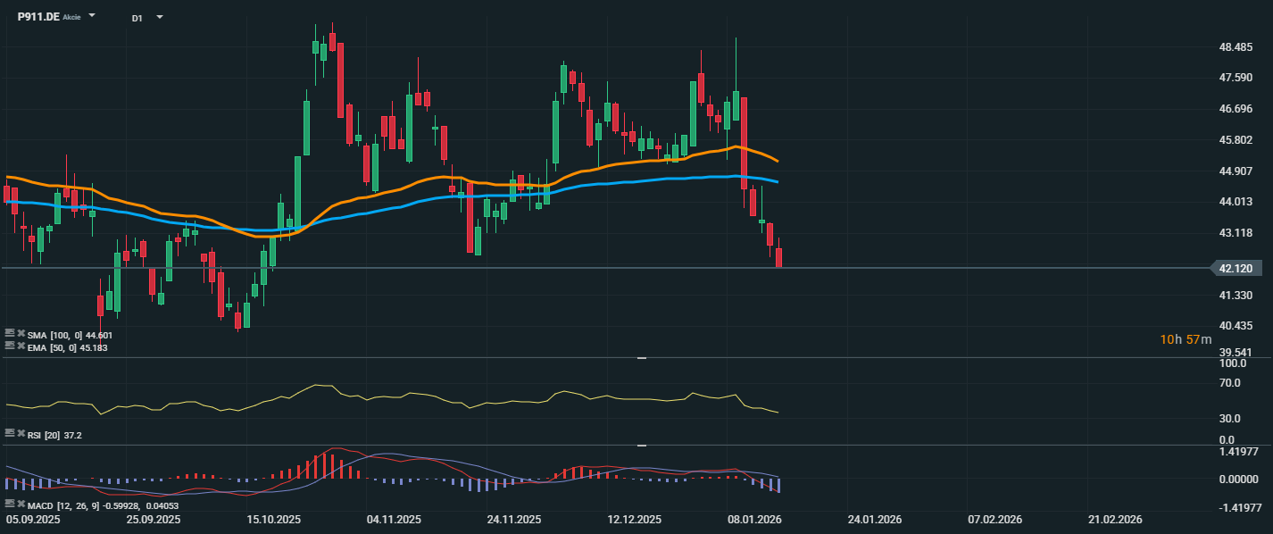Akcie společnosti Porsche se aktuálně obchodují na úrovni 42,12 EUR a pokračují v sestupném trendu, který byl zahájen začátkem ledna. Cena se propadla pod klíčové klouzavé průměry – EMA 50 (45,18 EUR) a SMA 100 (44,60 EUR) – což potvrzuje negativní technické nastavení. RSI se nachází na úrovni 37,2, což značí zvýšený prodejní tlak, avšak stále ještě bez dosažení přeprodaného pásma. Proražení pod oblast 43 EUR navíc narušilo předchozí obchodní konsolidaci a otevřelo prostor k možnému otestování nižších supportů – nejbližší podpora se nyní nachází v pásmu kolem 40,50 až 41,00 EUR. Z krátkodobého hlediska by návrat nad 44 EUR a zpět nad EMA 50 byl prvním signálem možného obratu, nicméně v současné chvíli je výhled jednoznačně medvědí.