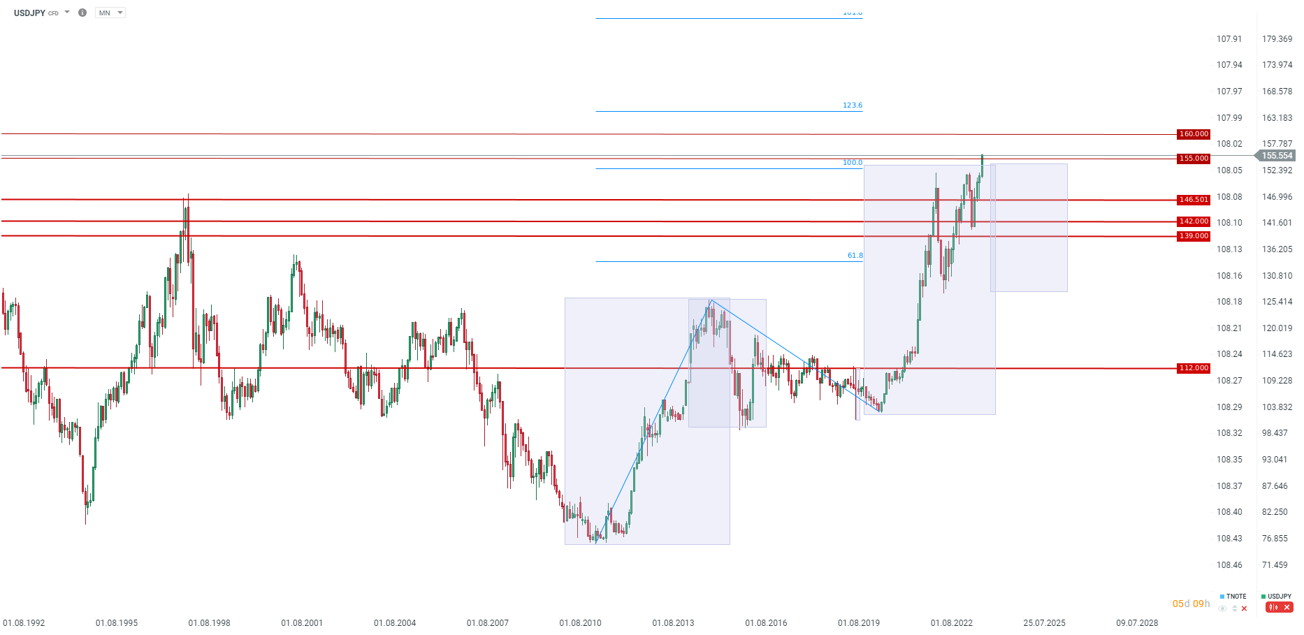 USDJPY proráží úroveň 155 Kromě toho pozorujeme, že pár proráží úroveň spojenou s rozsahem předchozí velké vzestupné vlny z let 2012-2015. Nicméně, pokud by BoJ byla během setkání velmi jestřábí, není vyloučen ústup do oblasti 153,5, což by generovalo potenciálně velmi silný signál pro pokles. Na druhou stranu se v tuto chvíli mluví spíše o mírném dalším oslabení jenu a růstu i kolem 160. Zdroj: xStation5