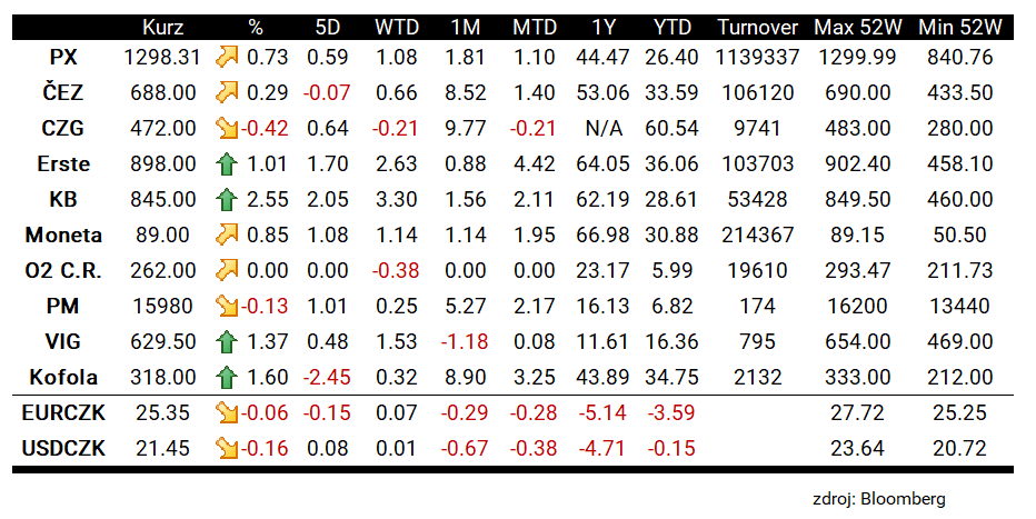Na finančních trzích dnes vládne smíšená nálada. Evropské indexy se krátce před závěrem seance obchodují převážně v zisku, ovšem Wall Street otevřela mírně do negativního teritoria. Akcie neuchlácholily ani nižší čísla inflace z USA, která byla zveřejněna odpoledne. Na hlavním indexu pražské burzy však po včerejším růstu zůstala situace pozitivní. PX přidal 0,76 % a uzavřel na 1298,68 bodech. Index tak dále navyšuje nejvyšší úrovně od roku 2011. Zároveň nabídl nejvyšší růst od 12. srpna.