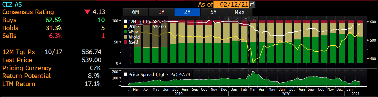Akcie společnosti ČEZ pokrývá 16 analytiků. Celkem 10 z nich drží doporučení "buy". Cílová 12 měsíční cena je na úrovni 586,74 Kč za akcii. Z aktuální ceny by tak akcie měly posílit o necelých 9 %. Zdroj: Bloomberg