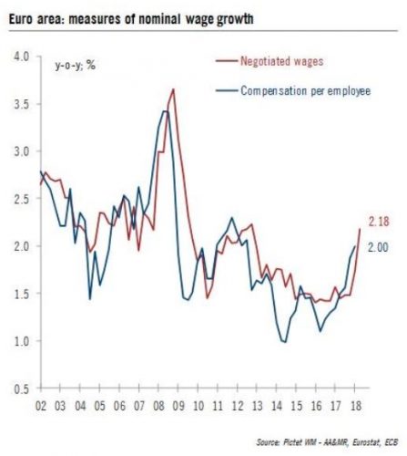 Aj napriek týmto pravdepodobným revíziám očakávam, že Draghi si zachová optimizmus ohľadom toho, že inflácia sa onedlho priblíži k dvojpercentnému cieľu. A to kvôli zrýchleniu rastu miezd. Aktuálne obe miery rastu miezd zrýchlili nad 2% a sú najvyššie od roku 2012. Model ECB hovorí jasne – rýchlejší rast miezd = vyššie inflačné tlaky. Vo svete to síce aktuálne úplne nefunguje, ECB však zatiaľ svojim modelom verí a práve preto podľa nej nebudú aktuálne slabšie čísla dôvodom pre paniku.