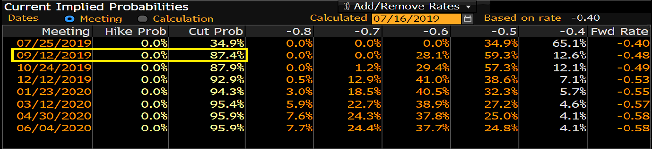 Trhy počítajú s 87,4% pravdepodobnosťou, že ECB pristúpi k zníženiu úrokových sadzieb v septembri 2019 (žltý obdĺžnik na grafe vyššie). Zdroj: Bloomberg