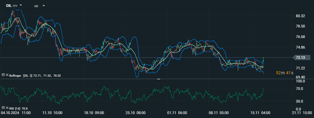 Vývoj cen ropy v návaznosti na očekávané změny regulací pod Trumpovou administrativou. Oscilace mezi 70–76 USD za barel odráží nejistotu menších producentů a dopad potenciálního zmírnění regulačních překážek. Pro analýzu byly použity nástroje Bollingerova pásma a RSI (Index relativní síly). Zdroj: xStation5