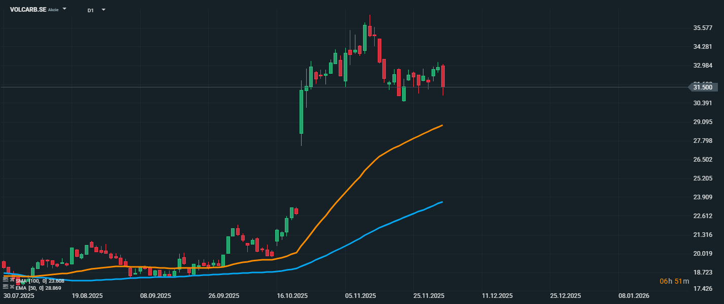 Akcie Volvo Cars se po prudkém růstu v říjnu a začátkem listopadu stabilizovaly a aktuálně se obchodují za 31,50 SEK. Cena se nadále drží vysoko nad klouzavými průměry, konkrétně EMA 50 na 28,87 SEK a SMA 100 na 23,61 SEK.