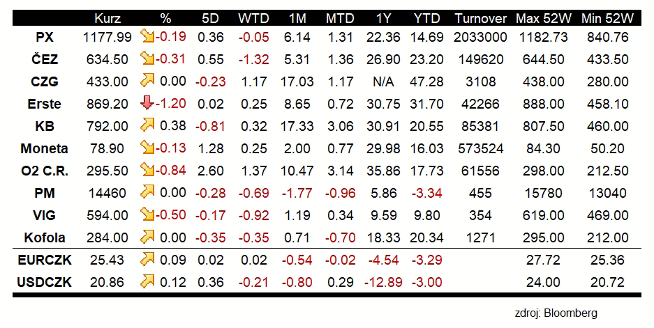 Hlavní akciové indexy dnes bojují o zisky. Trhy čekají na zprávy, které by je mohly posunout výše. Mírný růst výnosů z dluhopisů však ukazuje na vzestup rizikové averze. Hlavním tématem na trzích zůstává inflace. Ve čtvrtek budou zveřejněna inflační data z USA, která by mohla trhy přesvědčit k výraznějšímu pohybu. Burza cenných papírů Praha dnes ukázala poklidnou seanci. Vývoj se v průběhu dne mírně zhoršoval a index PX (CZKCASH) končil seanci na denních minimech. Ztratil 0,19 % a závěr ho zastihl na 1 177,99 bodech. Z blue chips zaznamenaly nejvyšší ztrátu Erste Bank (RBAG.CZ;-1,2 % na 869,20 Kč) a O2 (TELEC.CZ;-0,84 % na 295,50 Kč). Obě akcie však v posledních seancích výrazně rostly. Obstojný zisk naopak předvedla Komerční banka (KOMB.CZ;+0,38 % na 792 Kč). Osmi set korunová úroveň však stále zůstává nepokořena. Česká koruna dnes měla tendenci k poklesu. V 17. hodin se pár EURCZK obchodoval na úrovni 25,43 a USDCZK na 20,86.