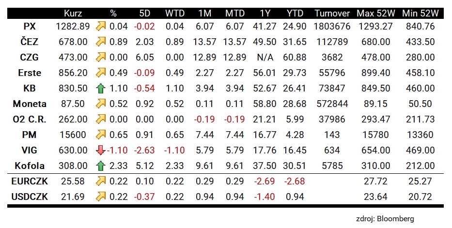 Dnes stála v čele zájmu Komerční banka (KOMB.CZ;+1,1 % na 830,50 Kč) a neutuchající zájem ovládá akcie energetického Čezu (CEZ1.CZ;+0,89 % na 678 Kč). Obstojně rostly také akcie tabákového koncernu Philip Morris (TABAK.CZ;+0,65 % na 15 600 Kč), která se nacházejí nejvýše od začátku dubna a v blízkosti nejvyšších úrovní za posledního dva a půl roku. Z blue chips akcií dnes klesaly pouze akcie společnosti Avast (AVST.UK).