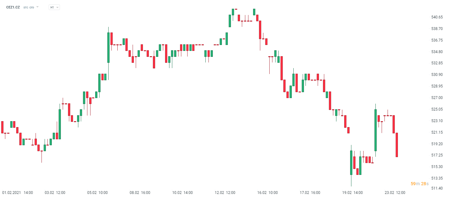 Akcie společnosti ČEZ hned po otevření trhu výrazně rostly, ovšem závěr seance téměř veškeré zisky smazal. Zdroj: xStation5