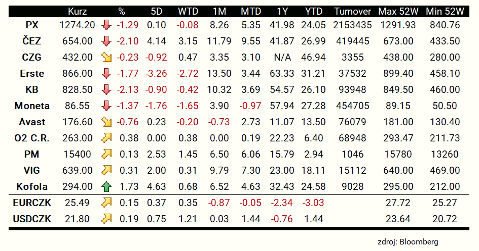 Nejvyšší ztráty zaznamenaly akcie Komerční banky (KOMB.CZ;-2,13 % na 828,50 Kč) a energetické společnosti ČEZ (CEZ1.CZ;-2,1 % na 654 Kč). I přes dnešní ztrátu však stále tyto akcie patří mezi nejvíce růstové v tomto měsíci. Nedařilo se ani zbytku bankovního sektoru. Výrazně ztratila také Erste Bank (RBAG.CZ;-1,77 % na 866 Kč) a o něco nižší ztráty předvedla banka MONETA (MONET.CZ;-1,37 % na 86,55 Kč). Z blue chips akcií jsme se však dočkali také pozitivních výsledků. Rostly akcie telekomunikační společnosti O2 (TELEC.CZ;+0,38 % na 263 Kč) a v černých číslech zakončil také tabákový Philip Morris (TABAK.CZ;+0,13 % na 15 400 Kč).