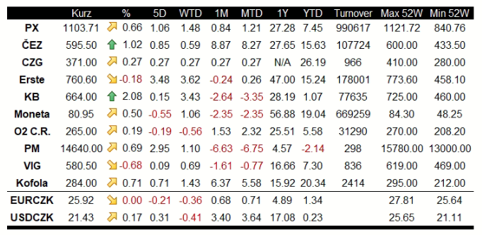 Evropské akciové trhy končí dnešní seanci na pozitivní vlně. Německý DAX přidává krátce před závěrem 0,45 % a obchoduje se v blízkosti 15 315 bodů. Stále se však nevymanil z pohybu do strany, ve kterém je už nějakou dobu uvězněn. Indexy na Wall Street se obchodují okolo včerejšího závěru. Hlavní index pražské burzy PX (CZKCASH) dokázal růst také třetí seanci v tomto týdnu. Přidal 0,66 % a uzavřel na 1 103,71 bodech. Obchodované objemy dosáhly na 463 mil. korun. Na čele pelotonu stála Komerční banka (KOMB.CZ;+2,08 % na 664 Kč), která postupně smazává ztráty z minulého týdne. Dnes se jednalo už o osmý více než dvouprocentní růst v tomto roce. Od počátku měsíce však akcie Komerčky stále ztrácejí 3,35 %. Solidní zisk předvedl také ČEZ (CEZ1.CZ;+1,02 % na 595,50 Kč). Den před zveřejněním hospodářských výsledků rostla také banka MONETA (MONET.CZ;+0,5 % na 80,95 Kč). Na dnešní valné hromadě banka neschválila vyplacení dividendy ze zisku za loňský rok. Spojení MONETY s PPF se na valné hromadě neprobíralo. Erste bank (RBAG.CZ;-0,18 % na 760,60 Kč) dnes jako jediná blue chips akcie skončila ve ztrátě.