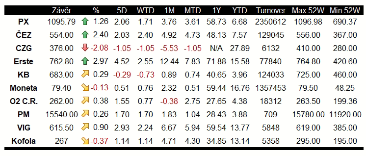 Index PX přidal 1,26 % na 2 141,96 bodů a rostl tak nejrychleji za poslední 3 týdny. Zároveň stále platí, že od počátku měsíce index zatím klesl pouze 3x. Obchodované objemy dnes vyšplhaly na nadprůměrných 748,1 mil. korun. Na růstu mají vzhledem ke své váze v indexu nejvyšší podíl Erste Bank (RBAG.CZ;+2,97 % na 762,80 Kč) a energetická společnost ČEZ (CEZ1.CZ;+2,40 % na 554 Kč). Naopak nejvyšší ztrátu zaznamenala Česká Zbrojovka (CZG.CZ;-2,08 % na 376 Kč) a z blue chips se do záporu ještě dostala MONETA (MONET.CZ;-0,13 % na 79,40 Kč).