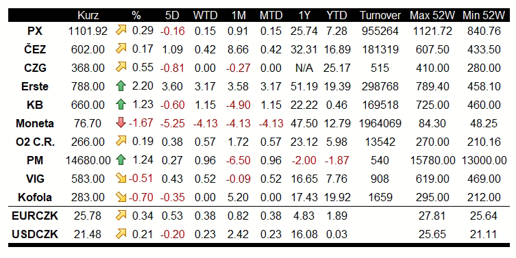 Hlavní index pražské burzy PX uzavřel už druhou seanci v tomto týdnu v zisku. Dnes přidal 0,29 % na závěrečných 1 101,92 bodů. Z blue chips klesaly pouze akcie MONETA Money Bank (MONET.CZ; -1,67 % na 76,70), které tak pokračovaly v negativním trendu posledních seancí. Banka v současnosti pracuje se společností PPF na ceně, za kterou by se mělo uskutečnit sloučení. Poslední poklesy mohou vypadat jako snižování podílu většího akcionáře před výsledky auditu. Od počátku týdne už akcie banky MONETA ztratily více než 4 % (viz tabulka). Naopak nejvyšší zisk dnes ukázala Erste Bank (RBAG.CZ;+2,2 % na 788 Kč). Komerční banka (KOMB.CZ;+1,23 % na 660 Kč) vykázala také výrazný vzestup. Komerční banka zveřejní již zítra své hospodářské výsledky za Q1 2021. Odhady výsledků od agentury Bloomberg naleznete níže.