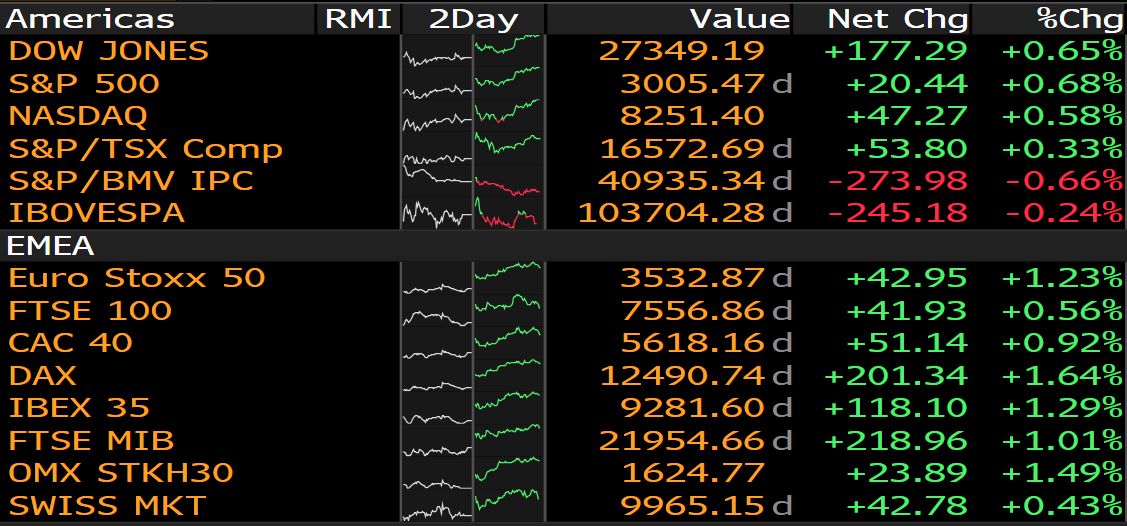 Závěr včerejší seance v Evropě a USA. Zdroj: Bloomberg