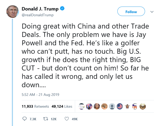 Svůj nemalý vliv opět předvedl také americký prezident Donald Trump, který se vyjádřil v tom smyslu, že obchodní smlouva mezi USA a Čínou bude pravděpodobně uzavřena. Trump také řekl, že americká ekonomika je silná a jediným problémem je Jay Powell a Fedu, čímž opět vystupňoval tlak na Fed ke snižování sazeb.