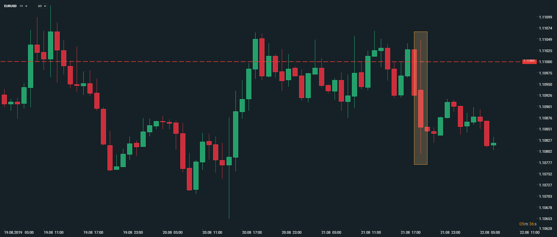 Vývoj EURUSD,H1. Žlutě vyznačena je reakce na Fed. Zdroj: xStation5