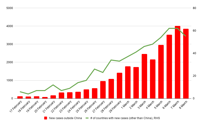 Počet lidí napadených koronavirem vystoupal nad 110 tisíc. Počet mrtvých se vyšplhal na 3831 případů. Počet případů v Itálii vystoupal na 7375. Počet případů v Německu a Francii překonal v obou případech 1000