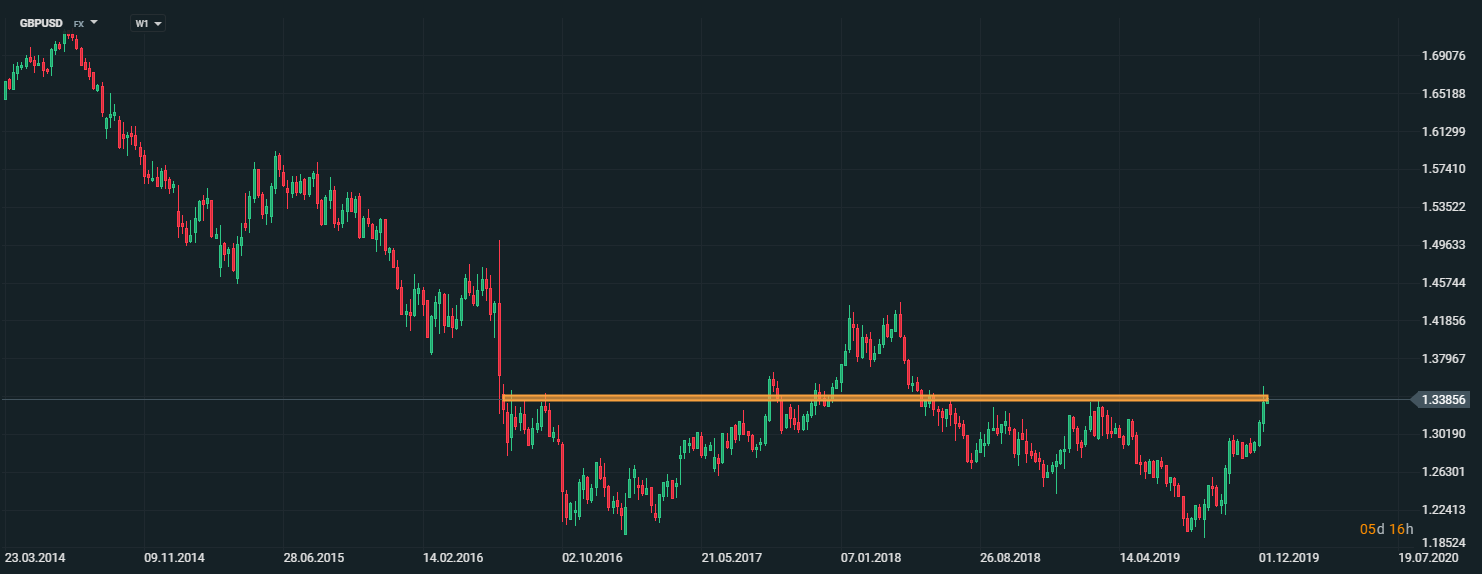 Britská libra ťaží z parlamentných volieb, ktoré sa odohrali koncom minulého týždňa. Menový pár GBPUSD testuje silnú rezistenciu v oblasti 1,34. V prípade, ak cena dokáže rezistenciu prekonať, otvorí sa priestor na rast až k úrovni 1,40. Zdroj: xStation5